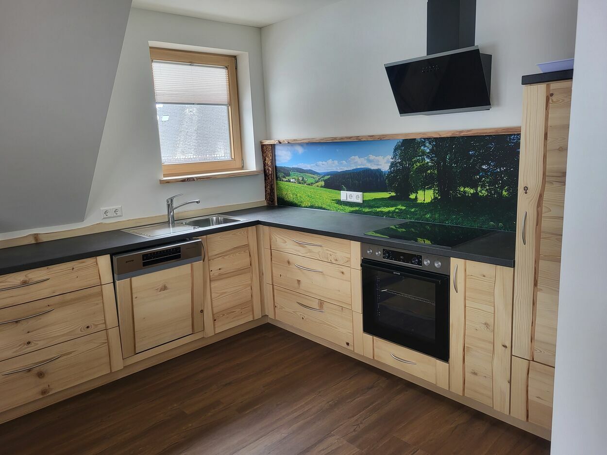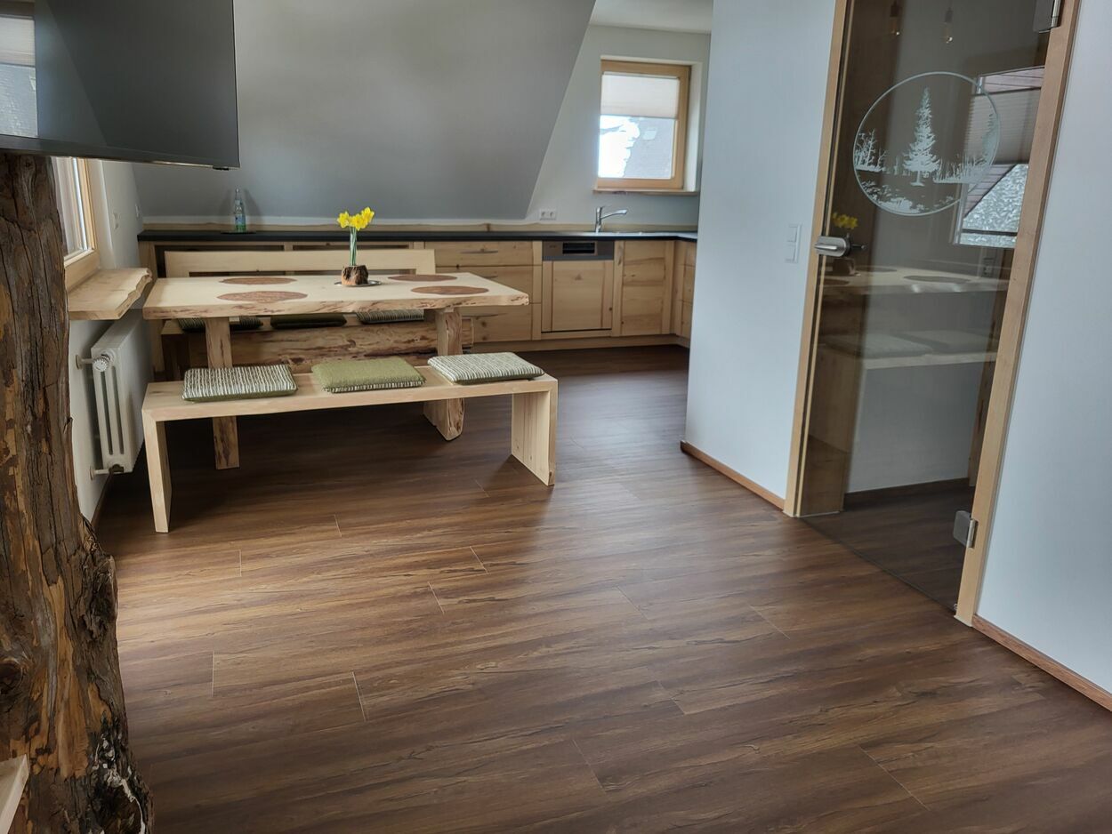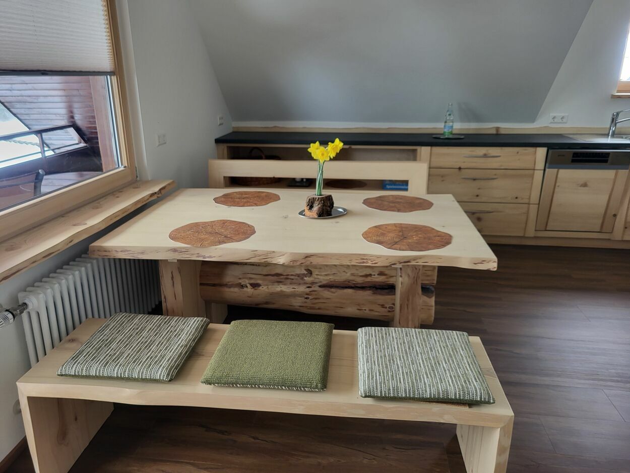 Auf 105 m² Wohnfläche bietet unsere liebevoll und freundlich eingerichtete Ferienwohnung Platz für insgesamt 5 Personen. Vom Schreiner aus der Region wurden die Möbel aus eigenem Tannenholz angefertigt.