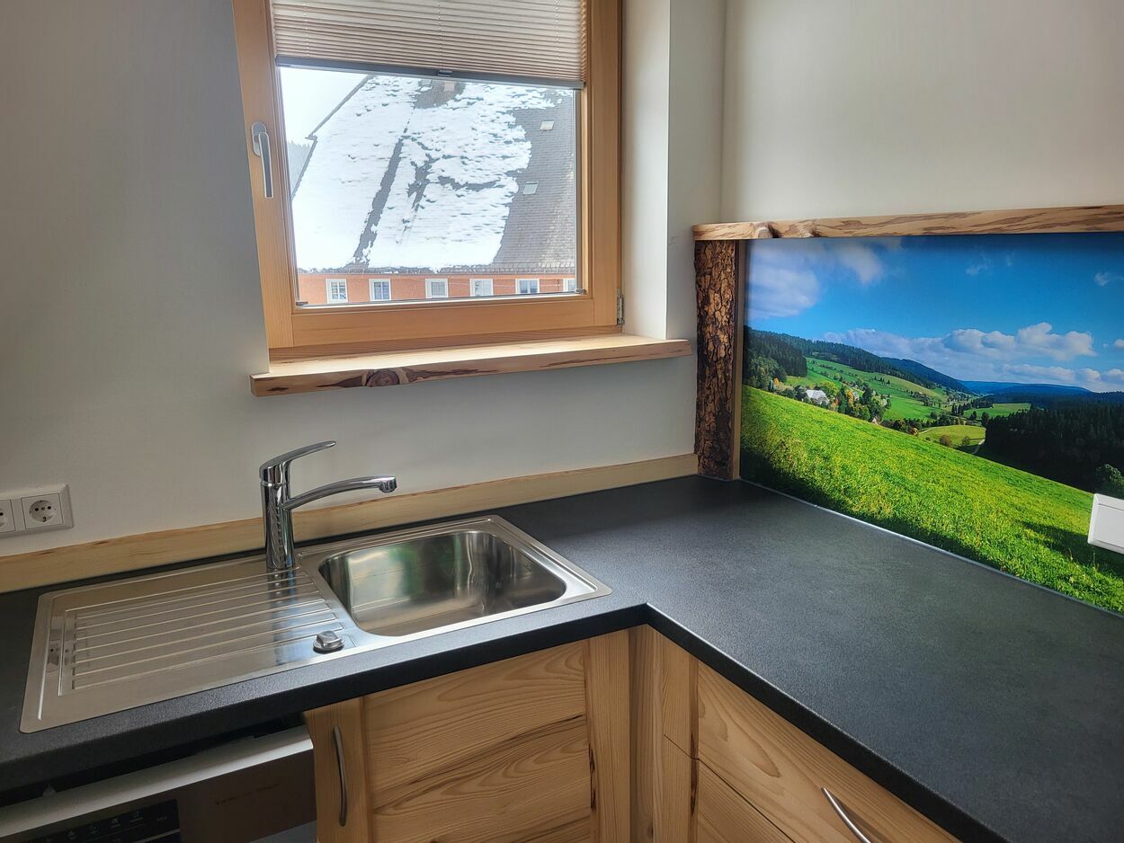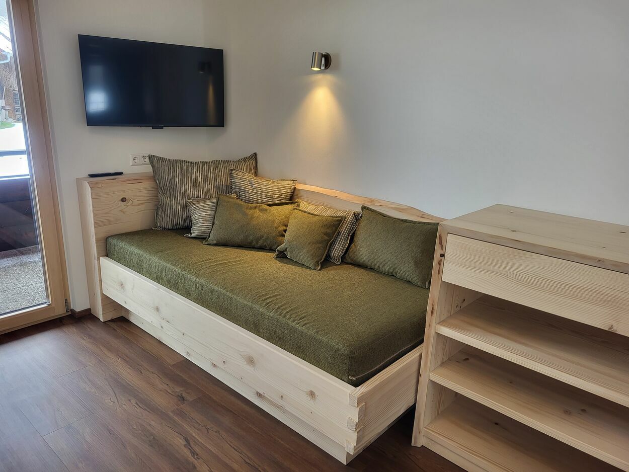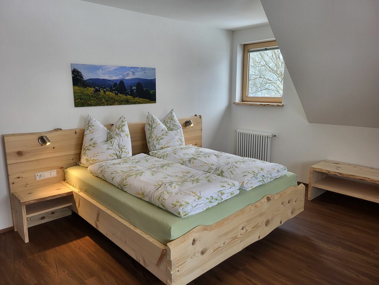 Auf 105 m² Wohnfläche bietet unsere liebevoll und freundlich eingerichtete Ferienwohnung Platz für insgesamt 5 Personen. Vom Schreiner aus der Region wurden die Möbel aus eigenem Tannenholz angefertigt.